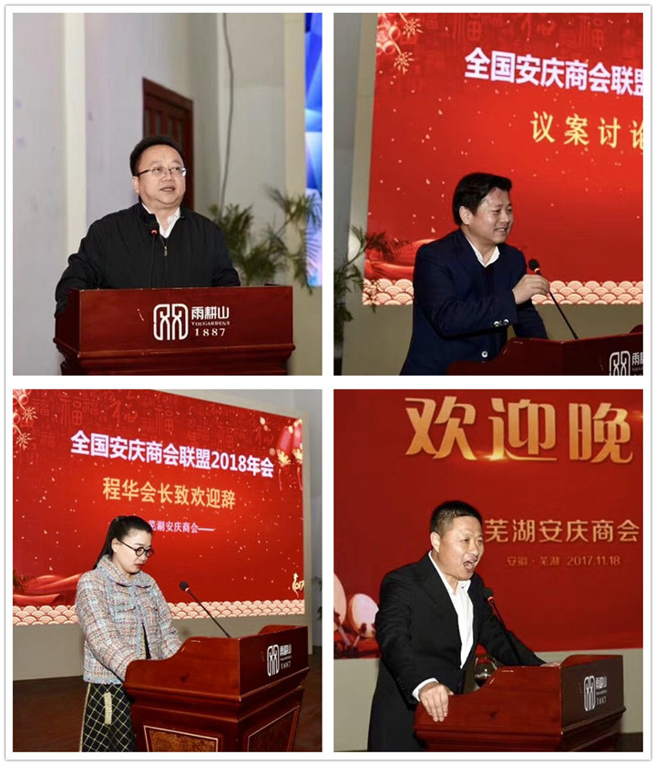 芜湖安庆商会会长程华、深圳安庆商会会长金红祥和上海安庆商会会长聂建明上台致欢迎辞并发表讲话。