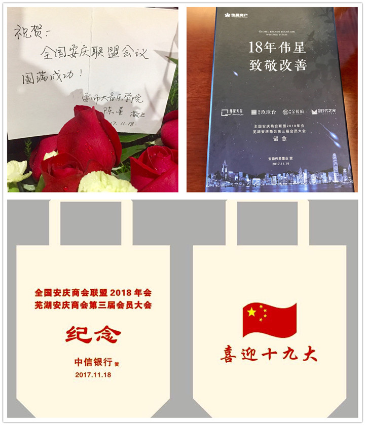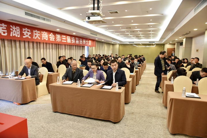 2017年11月19日,以"相识、相助、共创、共荣"为主旨的芜湖安庆商会第三届会员大会隆重召开。大会成功换届选举产生了新一届商会领导班子。安庆市委常委副市长蒲彦君,芜湖市副市长张志宏,原芜湖市长丁光涛、程晓苏,安庆市工商联主席王晓辉,芜湖市工商联主席孙四平,芜湖市民政局副局长李达志,安庆市下辖各区县的领导,与全国18家安庆商会会长、秘书长,以及芜湖安庆商会的会员企业家代表等,近五百人共同出席本次换届大会。